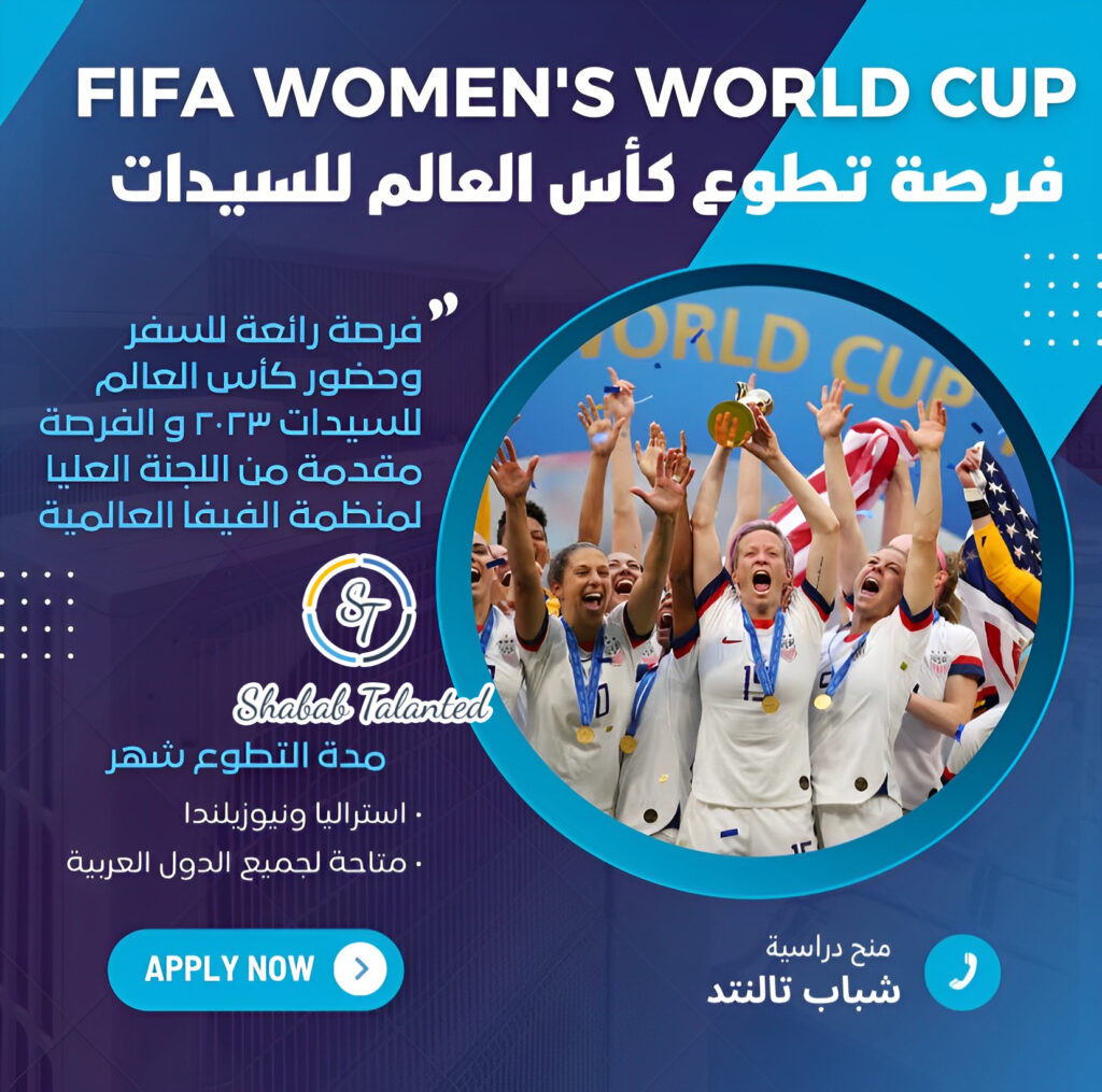 هي فرصة رائعة للسفر وحضور كأس العالم للسيدات ٢٠٢٣ و الفرصة مقدمة من اللجنة العليا لمنظمة الفيفا العالمية و من المُقرر أن تكون النسخة التاسعة من كأس العالم للسيدات . تجربة لا تنسي حيث يتنافس ٣٢ فريقا في ٦٤ مباراة عبر استراليا واوتياروا ونيوزيلندا .إذا كنت تريد الحضور والاقتراب من أكبر حدث رياضي للسيدات في العالم فقم بالتسجيل الآن .المتطوعون هُم الشغف ويد المساعدة والابتسامة الدافئة لكأس العالم للسيدات من خلال التطوع ستشارك . ستكون جزء من اكبر حدث رياضي للسيدات .
